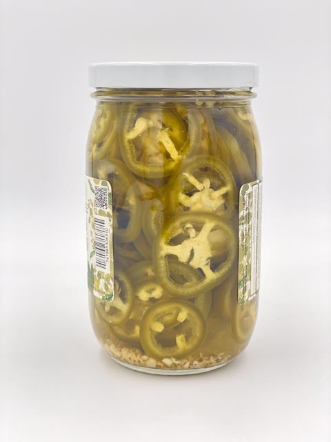 The ingredients include fresh jalapeño peppers, vinegar, and salt.